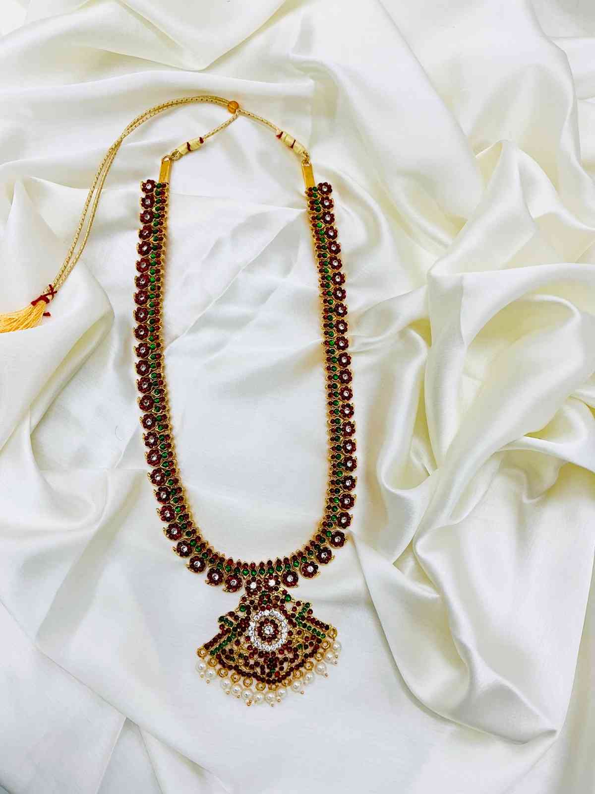 Kemp Stones: Long harams are embedded with vibrant Kemp stones—usually deep red, green, or sometimes white. These stones mimic the look of traditional South Indian temple jewelry.